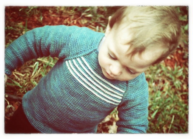The sweater for little L. is finished. I was not sure this morning that neither the weather nor little L. would cooperate for a little photoshoot, but the stars must have been smiling on me! It did not rain, and my adorable little man was in the mood to explore our still wintery back yard.